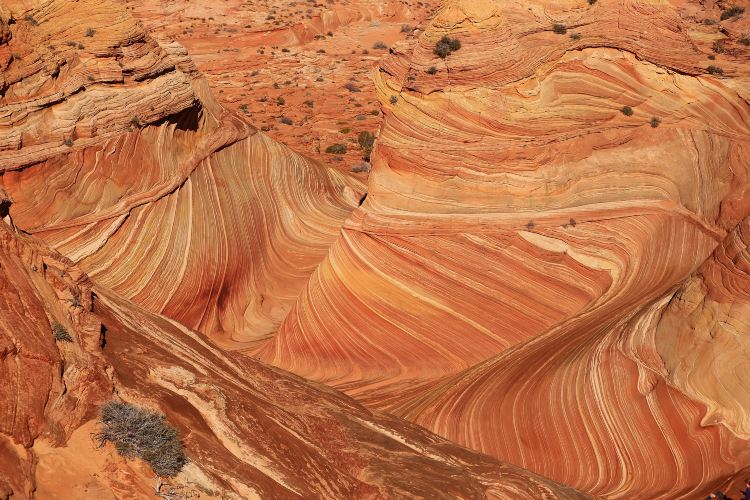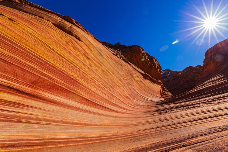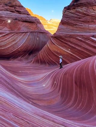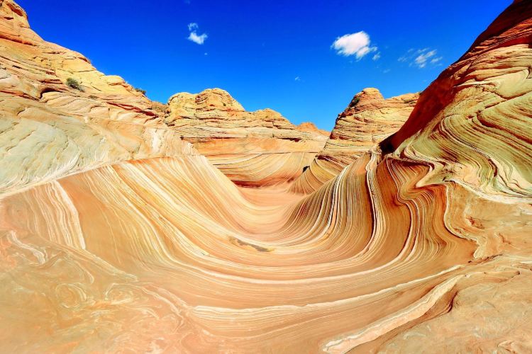 波浪谷地处美国犹他州南部与亚利桑那州接壤的帕瑞亚河畔,是一片有层叠状纹路的岩沙峡谷。谷中岩石的层面是由侏罗纪时期就开始沉积的巨大沙丘组成,沙丘不断被一层层浸渍了地下水的红沙所覆盖,天长日久,水中的矿物质把沙转变成了砂岩。而随着科罗拉多平原的上升,峡谷中形成了一种令人炫目的三维效果纹路。不过想要参观这样的鬼斧神工可不容易。不单单说要负重在高温的沙漠中徒步,要想被抽中许可进入景区也是不易。这里每天从一百多位申请者中抽选20人,使这里成为人人皆知却很难亲眼目睹的地方。