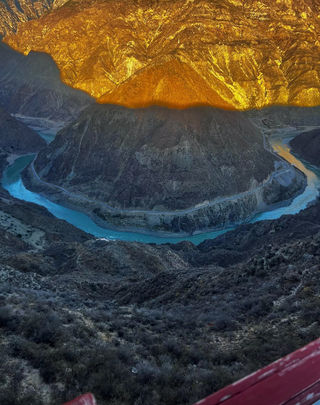 梅里雪山国家公园金沙江大湾在云南德钦县奔子栏镇和四川得荣县子庚乡交界处,金沙江在峡谷中转了一个“U”型大弯。在大地上勾勒出一条优美的曲线,被称为“金沙江大湾”。而形成第一弯是因对岸德荣境内的日锥峰,它以椭圆金字塔型的山体突兀金沙江峡壁,迫使江水围绕着峰体形成了一个大大的"Ω字形,而成了天下奇观。