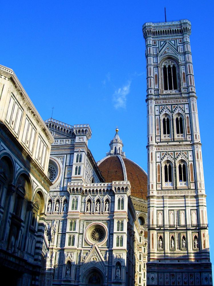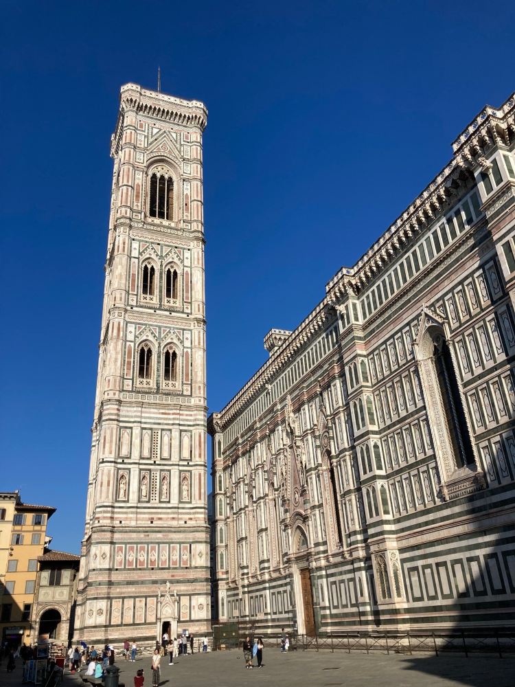 乔托钟楼就是圣母百花大教堂的钟楼,它位于圣母百花大教堂边上,是一座哥特式建筑的钟楼。而钟楼的对面就是八角形的洗礼堂。所以从主教堂正面看,它有着一个由洗礼堂和钟楼构成的一个不大的街面广场。