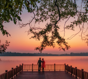 尤家花园位于颍上县县城西边的五里湖畔,是清末兖台府镇守使尤成章所建的私家园林,1923年,其子尤荫轩扩建老园,园林整体布局小巧玲珑,在皖北有这么一座苏式园林颇为稀奇,得到了“皖北豫园”的美誉。尤家花园一共有四个园区。第一园区内的盆景园吸引游客,有梅花、海棠、石榴等盆景,盆景的种类和数量都非常多。第二园区是看假山奇石、亭台楼阁的。第三园区为型松园,可以看到被修剪成各种造型的松柏,有的像伞,有的像塔,有的像鼓……造型生动。第四园区是新建的花园和植物园区。在这里,尤家花园的“花园”二字是名副其实的,园内的植被四季常青。此外,园内还有风波亭、读书堂、松桂亭、白玉塔、向桂楼、静坐堂、展望亭、将军碑亭等建筑,尤家花园不大,随意参观即可。