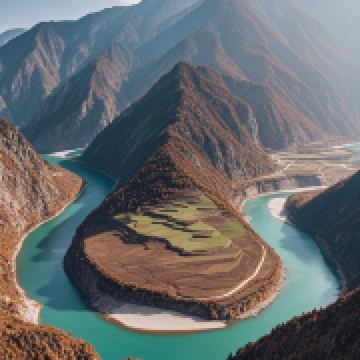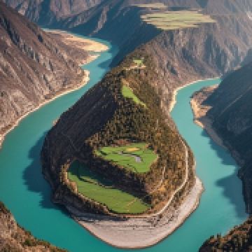 怒江流经贡山县丙中洛乡日丹村附近,受王期岩壁和丹拉大山的阻挡,掉头急转,形成了一个半圆形大弯,成为怒江大峡谷的标志性景观。半圆形大弯包住一块三面环水的半岛状小平原,风景秀丽壮观,平原上有个小村子叫坎通村。每当农闲假日,人们纷纷集中于此,或泛舟河上,或载歌载舞,一片和谐,堪称桃源仙境。从谷顶俯瞰,会看见湾中的台地和相连的王期山梁如同一只在海中遨游的千年巨人半身像。