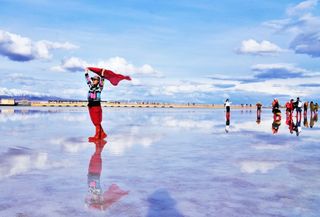 茶卡盐湖是一座有三千多年历史的盐场,湖水含盐量很大,会自然结晶成为一片白色的湖面,将天空、云朵和对岸的山都倒映在湖里,景色非常漂亮。游客还可以赤脚走到湖面上观看和拍摄自己的倒影,犹如天空之境。