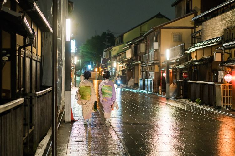花见小路灯影长,古雅木构韵悠扬。艺伎倩影留传说,石板幽径漫旧香,仿若时光亦缓行。