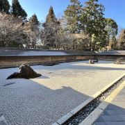 龙安寺是京都的世界文化遗产,1450年由细川胜元德大寺家出让的别院改建成禅寺。这里出名的便是方丈庭园,东西走向的长方形庭园中铺以白沙,配有15块大小不同的石头,是闻名于世的枯山水庭园。
