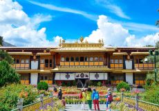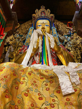 哲蚌寺坐落于拉萨西郊的山坳之中,寺院的建筑群规模宏大,白色的房屋和红色殿堂鳞次栉比的铺满山腰,远远望去像是巨大的米堆,对着山腰拍摄出的照片非常壮观。它在藏传佛教格鲁派中地位极高,内部建筑既大气又金碧辉煌,有很多美丽的珍宝,还有僧人的辩经仪式可以观看。