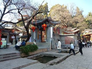 白马龙潭寺位于丽江古城南端狮子山脚,始建于清乾隆十九年,背靠狮子山,与山上之万古楼遥相呼应;寺前有一潭清泉,名狮乳泉,又称白马龙潭。寺外有三个用青石堆砌成的池子,潭水依次注入三个池中,这就是三眼井。