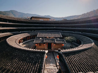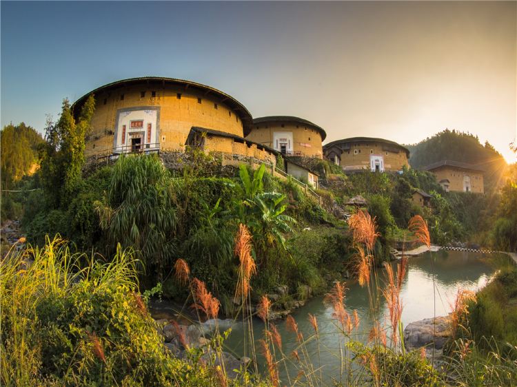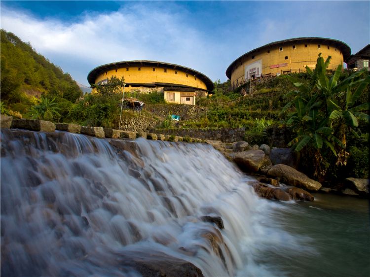 初溪土楼群是永定土楼群中保存原始的一群,依山傍水而建,有着悠久的历史,独特的建筑风格和古老的韵味赐予它较高的美学和历史价值。初溪土楼群的楼名中间都带有一个“庆”字,以示人丁兴旺、万事如意。其中有名、具代表性的土楼是拥有580多年历史的集庆楼。集庆楼是全国重点文物保护单位。1419年建成,为永定现存圆楼中年代久远、楼梯多、结构特殊的一座圆楼,楼里有72部楼梯,一户一梯,非常合理,令人称奇。集庆楼的房间、楼梯、隔门全用杉木构建,相邻处全靠隼头衔接,不用一枚铁钉,在穿越将近600年的风霜雨雪后,依然与厚达两米的生土墙一起巍然屹立,显得古老而不破败。初溪古村落景区里年轻的土楼是善庆楼,建于1979年,一楼走廊及天井全部用同一规格的方形花岗石铺就,采光通风的效果。走进善庆楼,犹如置身于阳光明亮的广场。