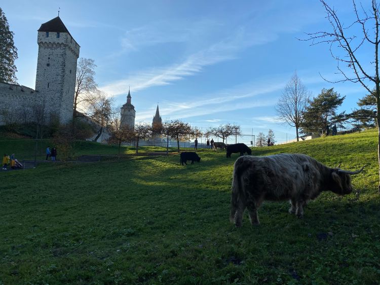 卢塞恩九塔是卢塞恩第二道防御工事的一部分。这里清晰的展示了工事的建造过程以及城市的防御体系。可以沿一些墙壁行走,有四座塔向公众开放,可以登上去观赏美丽风景。塔内有钟,很有趣,钟的机械装置清晰可见。