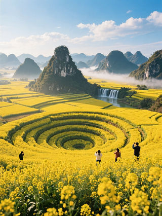 位于县城西北十公里处的牛街“螺丝田”是一个有名油菜花拍摄点,这里的梯田是圈状的,远远看去真像是螺丝上的旋纹。 牛街“螺丝田”是由串珠岩溶漏斗地质地貌构成的自然景观,漏斗如此密集,形态如此奇特,目前尚不多见。景观深50米,呈东北——南西向,梯式水田和旱地,一层层齐整整。