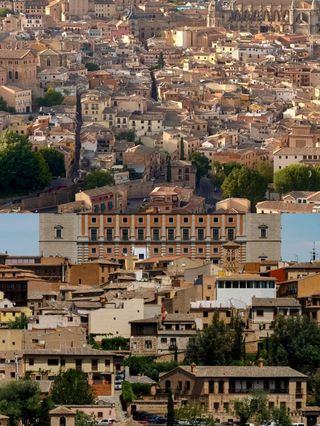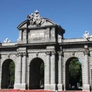 独立广场-阿尔卡拉门建于1788年,由卡洛斯三世下令修建,萨巴蒂尼为设计师,。是马德里现存完好的古城门之一,曾经是19世纪时马德里的东侧边界标志。大门为新古典主义风格,由白色花岗岩打造,有5个门洞,中间3个半圆拱门上部以石造狮子头为装饰,另2个为平拱门,是18世纪欧洲的建筑巨作,富有创意性。
