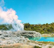 位于北岛罗托鲁瓦的爱歌顿农场是新西兰大,先进的观光农场,面积约150公顷。在这里你可以与红鹿、火鸡、驼鸟、羊驼、乳牛、小绵羊以及很多你从未见过的羊等动物。农场每天都有剪羊毛、挤牛奶等表演秀,十分精彩,乐趣无穷。农场门口展示着标志性的剪羊毛铜像和古老的马车架,爱歌顿农场占地面积很大,游览牧区需要乘坐观光拖拉机,坐上拖拉机出发,一路上会看到成群结队在路边悠然吃草的奶牛、绵羊等。拖拉机会在一片空旷的草地上停下,届时附近的绵羊都会闻风跑过来将你包围。在羊驼区,高大的羊驼有着十分温顺的性情,你可以尽情与它们互动合影。除了与各种动物亲密接触,你还能参观农场果园,一睹成片的奇异果树,品尝口味独特的奇异果蜂蜜。