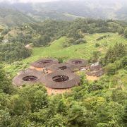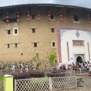 田螺坑土楼群被称为是福建土楼的标志性建筑,也是福建土楼的名片,由于它的外形是四座圆楼簇拥着一座方楼,所以也被人们形象地称为“四菜一汤”。土楼的外形像是一朵怒放的梅花,美妙绝伦,璀璨夺目,又像是一支气势磅礴的五重奏交响曲,在青山秀水间激越地奏响。公路随着山势蜿蜒而下。随着观看角度的变化,田螺坑景区景观魔术般地不断变幻,圆楼时而在前时而退后,方楼时而隐蔽时而暴露。来到坡底公路上,抬头往上看,它犹如布达拉宫横空出世,巍峨耸立,庄严肃穆,在阳光下一派金碧辉煌。