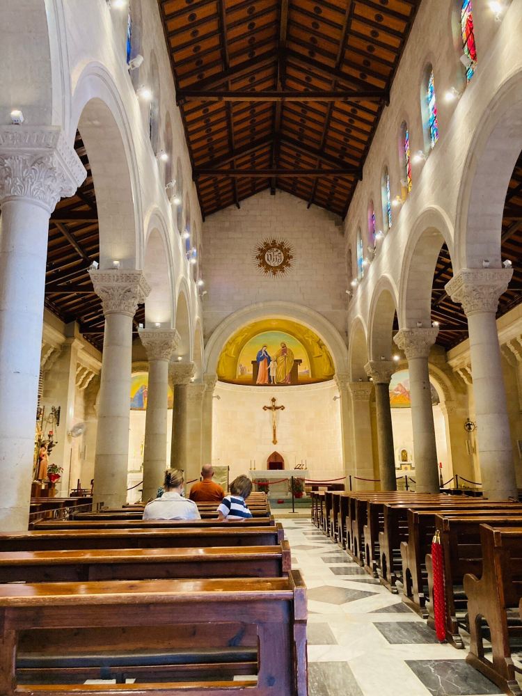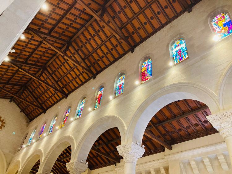 该教堂位于拿撒勒,外面有圣约瑟夫的雕像,教堂的祭坛上有精美的壁画,彩色玻璃窗和地下室的展览令人印象深刻。