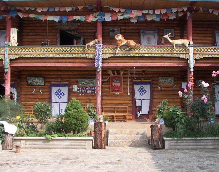 从纳西族村翻过一座葱茏的小山峦,紧依“泸沽湖”畔建有一座摩梭人居住的“木楞房”,这座全部用圆木建成风格拙朴的四合寨楼取名为“摩梭之家”。摩梭人居住在滇西北高原永宁地区的泸沽湖畔,人口约八万多,至今还保留着母系氏族形态和母系家庭生活习惯。这一奇特的民俗引起了全世界人类学家的关注,同时给摩梭人增添了奇异、神秘的色彩。摩梭人的房屋结构一般为四合院,全用圆木做成,摩梭人称它为“私鲁鱼垮”,意为木头房,也叫木楞房。房屋正房中间为老人房,即“老祖母房”,老祖母是摩梭家庭中身分地位较高的辈分,掌管着家庭的财政和决策权。老祖母房集卧室、客厅、厨房为一体,房里有两根重要的房柱,左柱代表男,右柱代表女,男柱右侧一个佛台,摩梭家庭称它为“司土”,即“房心佛”。房内正中墙壁上挂有一块火神牌,它象征着母系家庭象火一样的旺盛,是家庭里的吉祥物,房内还放有摩梭人腌制的“猪膘肉”,又名“琵琶肉”。它是由整头猪腌制的,可以入一、二十年不变质,是摩梭人饮食特产。“摩梭之家”这个风光秀丽、充满神秘色彩的地方,热情好客的摩梭姑娘载歌载舞,向贵宾献上酥油茶,为游客荡起“猪槽”船,一曲情深意长的“玛达咪”,使人久久不能忘怀。
