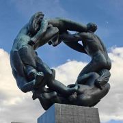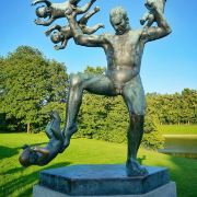 挪威雕塑师维格朗晚年时花费20多年心血精心完成了近200座神态迥异的人物雕像,总共有650个人物浮雕。这些雕像全部矗立于首都奥斯陆的西北角的维格朗雕像公园。走进这座绿意盎然的公园,可以看到开阔的草坪、茂盛的树林,还有池塘等景观,是人们散步和野餐的好地方。公园中间的人行道两旁错落有致地排列着各种与真人一般大小的雕像,而这里面比较有名的是一座17米高的生死塔,塔上雕刻了121个人物复杂地纠缠在一起,描绘了世人不满于人间生活而向“天堂”攀登时,相互倾轧和相互扶掖的情景。