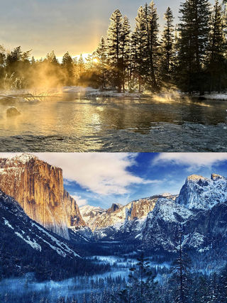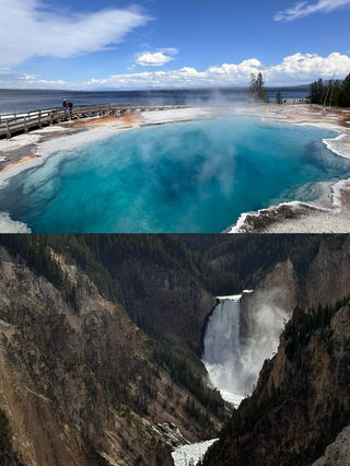 黄石公园非常有名的景观之一,可以同时观赏壮观深邃的峡谷和飞流直下的瀑布,天气好,会看到一道彩虹横跨峡谷。黄石大峡谷有两个瀑布,Upper Fall上瀑布和Lower Fall下瀑布,下瀑布的落差更大,也更壮观,Artist Point是拍摄下瀑布的好位置。长期的河水冲刷形成了色彩瑰丽的岩壁,呈现出黄、橙、棕、褐等,印第安人称之为“黄石”。