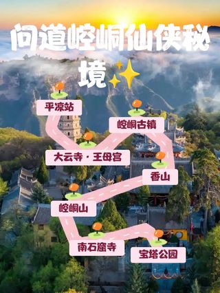 该景区以人文景观和丹霞地貌地质遗迹景观为主,以中台为游览中心,可依次游东台卧观平凉、云鹤归宋、南台蜡烛峰、北台一线天、药王洞等。沿途自然风景优美,人文景点较多,庙宇星罗棋布。其次为森林植被景观,有高大的紫果云杉、油松、园柏、国槐、五角枫等。