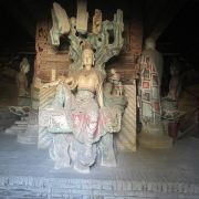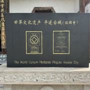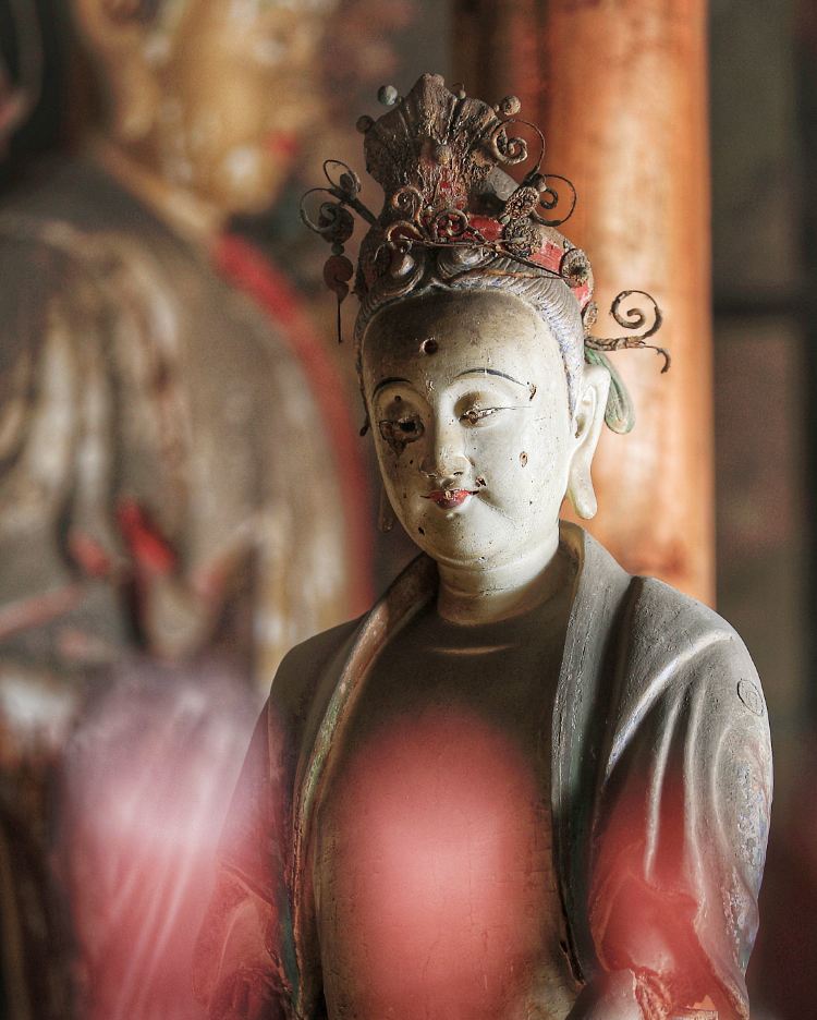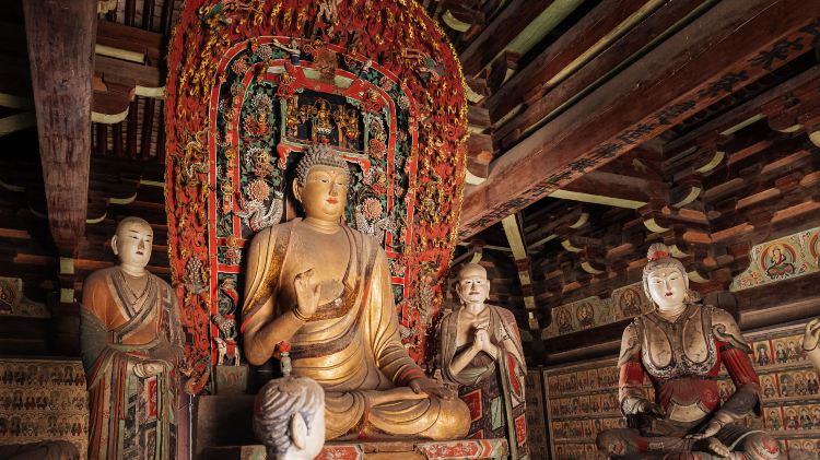 平遥县城东北约15公里处的郝洞村,有一座始建于北汉天会七年(963年)的古寺——镇国寺,清嘉庆二十一年(1816年)重修,在我国现存的木结构建筑中,平遥镇国寺仅晚于五台山的南禅、佛光二寺院,是我国现存古老的木结构建筑之一。镇国寺面积并不大,重要的建筑是中轴线上的大殿,也称为镇国寺-万佛殿,大殿的飞檐近2米,殿堂整体“梁架”结构严密,工艺精湛,完整保留了一千多年前五代时期(907-960年)的木结构建筑架构。在镇国寺-万佛殿内,能够观赏到14尊珍贵的塑像,其中有11尊是五代时期的塑像,虽然已经过去千年,但这些塑像依然色彩鲜艳,是古代雕塑艺术中的精品。这些塑像中以四尊供养菩萨为奇特。其中两尊坐像衣冠紧扣,面颊丰满,安详的端坐在莲花台上;另外两尊供养菩萨随意的站在一边,体态丰满,曲线呈优美的“S”型,给人无拘无束的感觉,具有古代女性特有的娇柔,这种形态与传统观念中威严端正的菩萨形象完全不同,看上去更像一位婀娜多姿的舞女。在镇国寺-万佛殿前中楼内有一尊金代(1115-1234年)的铁钟,据说铁钟的钟声可以传到几十里外的平遥城。在镇国寺-万佛殿后的三佛殿内,墙壁上画满了明代的佛教故事壁画,细腻生动。