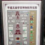 平遥文庙,又名文庙学宫,建于唐贞观初年,其中大成殿为金大定三年(公元1163年)重建,距今已有800多年的历史,至今保持原貌,这是我国现存各级文庙中历史悠久的文庙,是中国保存完整的文庙建筑群。平遥文庙中的主要古建筑有城墙上的文昌阁、魁星楼、石牌坊、城墙下的文昌庙,登攀城墙的云路、云路坊、状元桥、影壁、棂星门、泮池、大成门、大成殿、明伦堂、敬一亭、尊经阁、东西庑、日新斋、时习斋、腋门、厢房、神厨、神库等。建筑物古朴典雅,各类石刻、木雕莫不精工细作,具有很高的艺术和历史价值。在平遥文庙内,能看到中国大的孔子及儒学先贤塑像群。孔子像左右分别为“四配”:述圣孔亻及、宗圣曾参、复圣颜回、亚圣孟轲;东西供台上为“十哲”,分别为仲由、卜商、冉雍、冉耕、冉求、宰予、端木赐、闵损、言偃、颛孙师均为孔子的得意门生。此院的配殿东庑、西庑供奉七十二贤人。值得一提的是,为一代宗师孔子立像古今皆有之,而再现其弟子彩塑群像在国内孔庙中这里是规模大的一处。这些塑像的后墙上还绘有孔子圣迹图,从颜母祷尼山开始,到孔子去世后弟子庐墓为止,把孔子一生主要活动以壁画形式,惟妙惟肖地展现在游客面前。在文庙游玩时,有兴趣的还可以去大成殿内中国惟一的专业性摄影博物馆转转,文庙内还有中国现存规模大的中国科举史展,陈列着中国现存的一张状元试卷、清代文官系列服饰等一大批珍品。