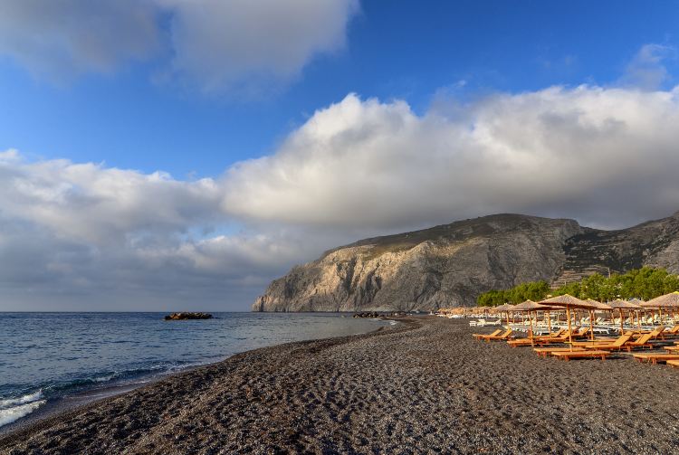 卡马里是希腊圣托里尼岛上的一个知名海滨度假胜地,以其独特的黑沙滩而闻名。黑色的火山沙滩与碧蓝的爱琴海形成鲜明对比,是游客放松和享受阳光的理想之地。沿着海滩,有多家餐厅、咖啡馆和酒吧,提供丰富的当地美食和饮品,游客可以在此享受悠闲的用餐体验。