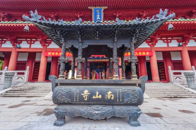 南山寺位于海南三亚南山文化旅游区,是一座仿古盛唐风格的寺院。这座寺庙的规模很大,整体气势恢宏。寺院建有仁王殿、大雄宝殿、东西配殿、钟鼓楼、转轮藏等,分别供奉门神哼哈二将、释迦牟尼佛、阿弥陀佛和药师佛、十六罗汉。
