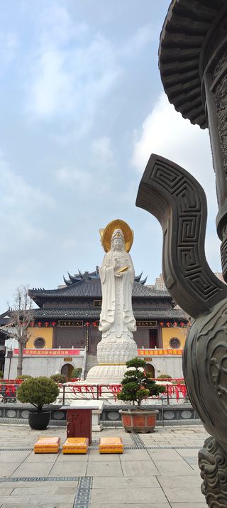 看了推送才知道离周浦小上海不远还有这么一个清静之地。跟着百度地图一路寻过来,远远地就望见殿宇的房顶,不过走到进前突然有点懵,怎么找不到大门?后来发现就是从停车场进去。然后看到小桥便是。过了桥即是一座九龙壁,有点意思的是此壁初看是七龙,仔细一数是九龙。进庙后有座露天观音像也是寺中一大景。