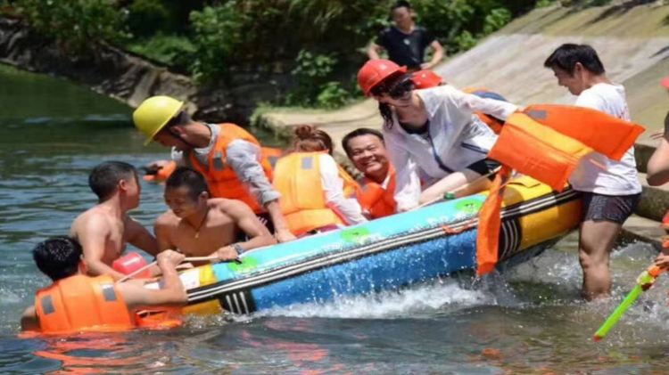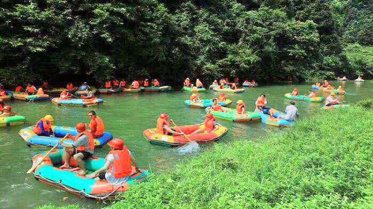 我们几家人带孩子一起出游,当天早上八点多就有景区工作人员给我打电话说11点前需赶到,1点开漂,千万别迟到!结果我们11点前赶到,等到12点才出发去漂流上游,领了救生衣,安全帽和船桨,上了皮艇,等待开漂……结果中午的大太阳硬是让我们晒了一个多小时,后面陆续还来了很多游客,2点钟才开始漂!水很浅,暗礁多,艇经常被搁浅,还得下艇推,又由于艇多,一齐经过狭窄险滩时被掐住了,结果后面的艇就把前面掐住的艇撞翻了……