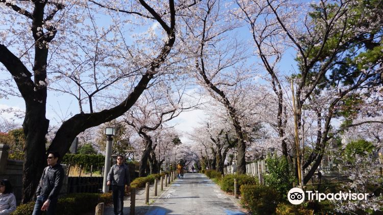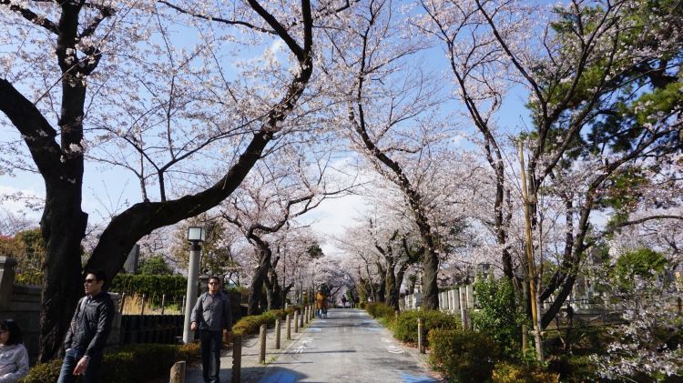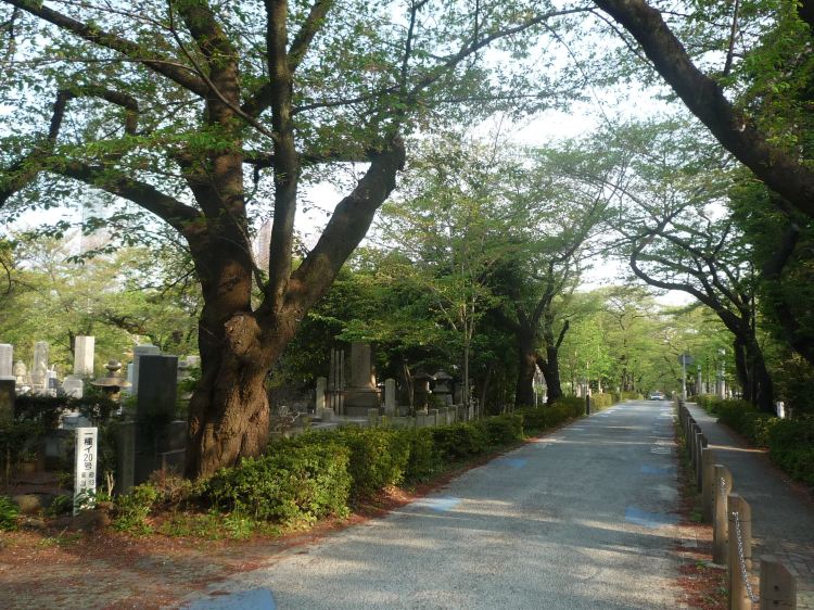 青山公墓是有名的赏樱地,墓地历史悠久,地势较平坦,贯穿中心的道路两旁种满了樱花。