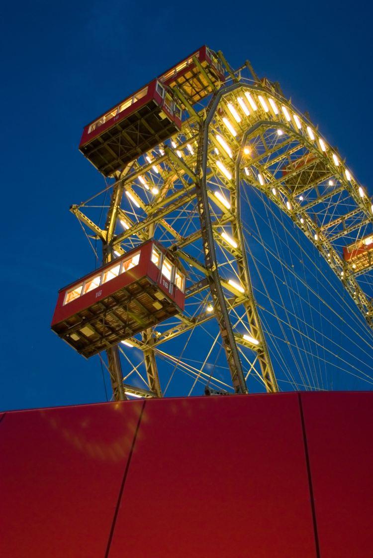 普拉特公园里的维也纳摩天轮是城市的地标之一。为纪念弗朗茨·约瑟夫皇帝登基50周年,维也纳人在1897年建造了这座摩天轮。维也纳摩天轮坐落在普拉特游乐园右侧的入口处,高65米,直径近61米,通体钢制结构重达430公吨,转速为2.7千米/小时。一直以来,它都是维也纳天际线的象征,坐拥这座多瑙河畔之城的旖旎风光。