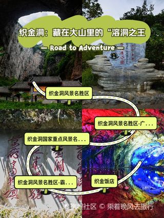 织金洞,是中国目前发现的一座规模宏伟、造型奇特的洞穴资源宝库,洞中遍布各种形状的石笋、石柱、石芽、钟旗等,形成千姿百态的岩溶景观。由于整个洞穴景区的游览路线是单向行走路线,所以只要进洞就必须走完全程,从出口出来以后再搭乘电瓶车回到景区门口。