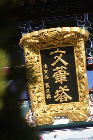 文笔塔高49米,塔为八角形,七层八翘,层层重阁,古朴典雅,塔身整体为红色,显得雄伟壮观、庄严挺拔,金碧辉煌。塔身内外题诗藏画,雕梁画栋,流金溢彩,妙趣横生。而塔的翘角处,挂满了一串串的铃铛,每当有风吹过,便会发出叮叮当当清脆悦耳的声音。沿着塔身看一圈,南面有金慈昆的“文势壮山河极目远天葱与莽,笔锋挥古今翘楚方史汉及清。