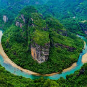 武夷山九曲溪位于武夷山风景区,之所以叫九曲溪,是因为这条溪弯弯曲曲的,经星村入武夷山,折为九段,分为九曲。一曲就在武夷山九曲溪的下游,武夷山前,睛川一带。它的景色畅旷豁达,附近有大王峰、幔亭峰、狮子峰和观音岩。过了一曲后右折,从浴香潭北上,就是二曲。二曲是一段幽深险峭的峡谷,玉女峰就在二曲西侧,与大王峰隔溪相对伫立在溪水旁。这段主要景点有:玉女峰、仙榜岩、仙馆岩等。