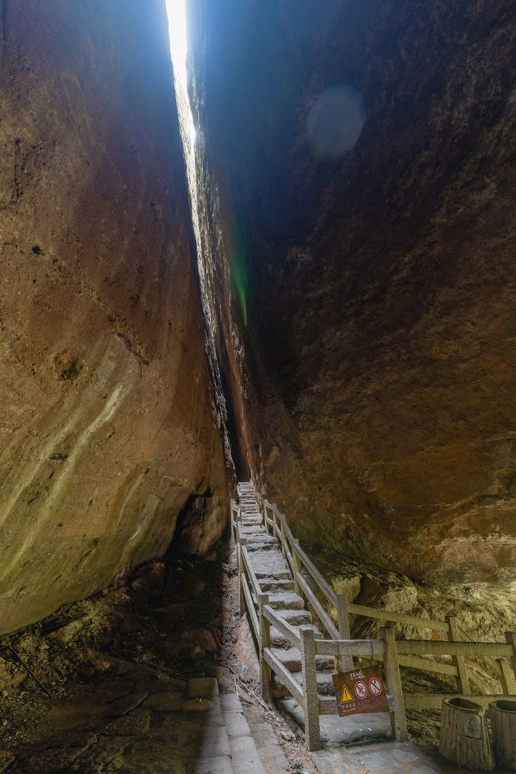 一线天又称一字天,位于武夷山国家公园群峰南端之二曲溪南面的一个幽邃的峡谷里。武夷山风景名胜区-一线天景区有一座巨岩,宛若城廓,名甫灵岩。岩倾斜而出,覆盖三个毗邻的山洞,其顶有裂隙100余丈,宽不及1米。探身洞中,仰观崖顶裂隙,可见天光一线奇景,此即“一线天”。三洞名伏羲、灵岩、风洞,前后通连,由一线天兜进的风,转从风洞而出,迅疾不停,到此顿觉凉爽。灵岩洞终年滴水,汇成一壑清泉,叫圣水。洞南有一座巍岩,名楼阁,传说中谓之神仙楼阁,岩壁题刻颇多。另有兰岩、石门诸胜。