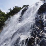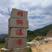 雄狮瀑布地处同安和安溪交界处南山、尖山间2千多米长的峡谷中段(同安莲花镇军营村附近),因其壶口状似发怒雄狮而得名。雄狮瀑布高达百米,宽面52米,水量充沛,一年四季奔腾不息,被誉为“闽南第一瀑” 。奇妙的是,瀑布下端挺出一块巨岩,酷似发怒的雄狮蹲在瀑布底部,水流冲浴着狮头,倾泻而下。巨大的水幕奔腾呼啸,发出狮吼般的轰鸣声在山谷间回响着,故名雄狮瀑布。瀑布下方的水潭约200平方米、有5米深,瀑布泻落处,形成一泓数百平米的碧水,像是一面玉镜,轻风吹来,荡起几波涟漪,碧水顺着地势,穿行在峡谷里。