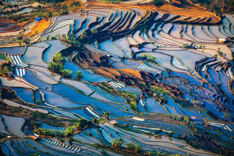 老虎嘴梯田分布于深谷间,形状各异,是元阳哈尼梯田极具有代表性、壮观的地方。一望无垠的梯田从深谷伸高,又与山梁上的梯田相连,形成立多彩的梯田海洋。