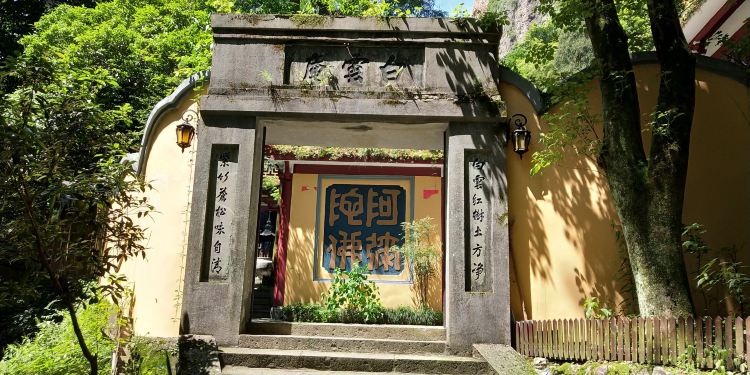 白云庵位于倚天嶂下,是雁荡山大规模的庵堂,门口书“阿弥陀佛”,后为“回头是岸”。庵内具特色的是观音楼,一楼供奉释迦摩尼,二楼供奉千手千眼观音,并做藏经阁,珍藏一部《大正经》。楼的前方是大雄宝殿,供奉三圣佛,大殿背后为地藏王菩萨。