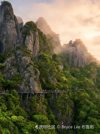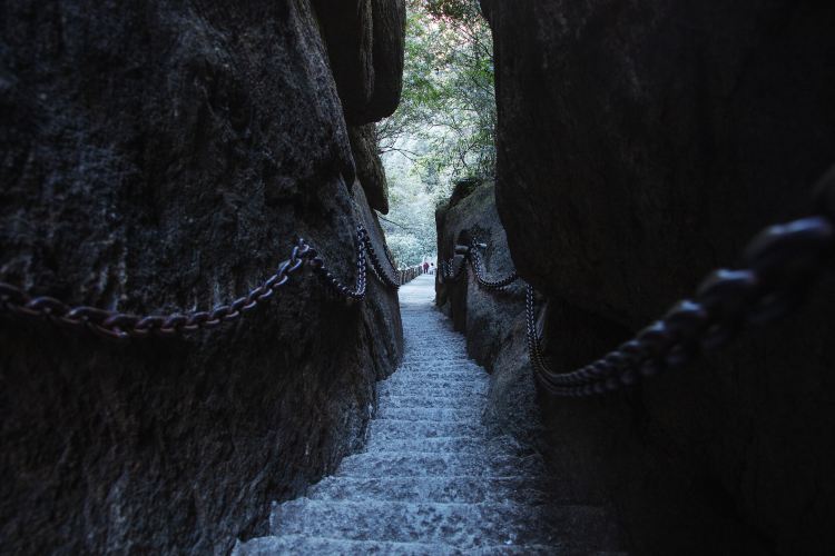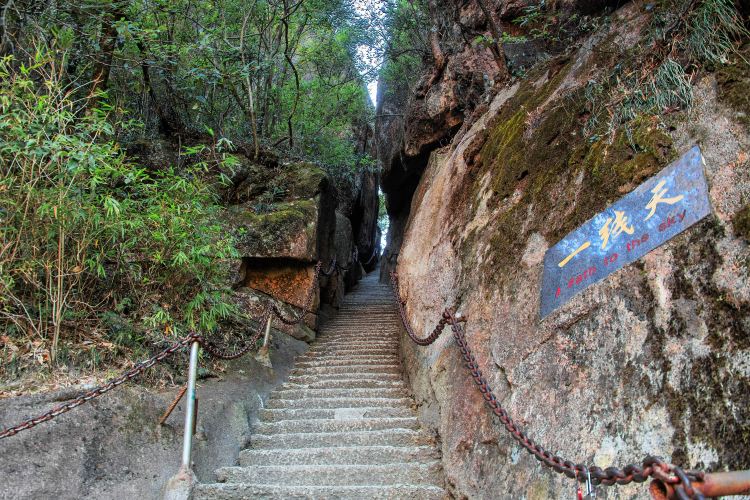 一线天位于在三清山南清园景区内,因两壁夹峙,缝隙所见蓝天如一线而得名。从神龙戏松绝景前往玉女开怀,便是一线天峡谷,高度近100米,斜长120米,峡谷宽0.7到1米。