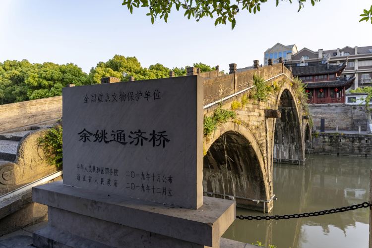 通济桥位于余姚市城中的姚江之上,又名舜江桥,是沟通余姚南北两城的重要桥梁。由于它是姚江上较长较高的桥,桥全长90米,高大雄伟,桥旁立了一块石碑,上面题道:“海舶过而风帆不解”八个字。北宋时王安石任鄞县县令时旅行至此,更是情不自禁地赞叹道:“山如碧波翻江去,水似青天照月明。唤取仙人来此住,莫教辛苦上层城。”