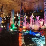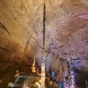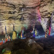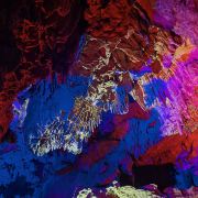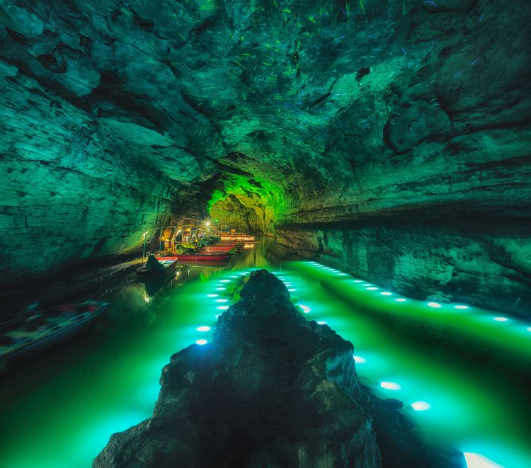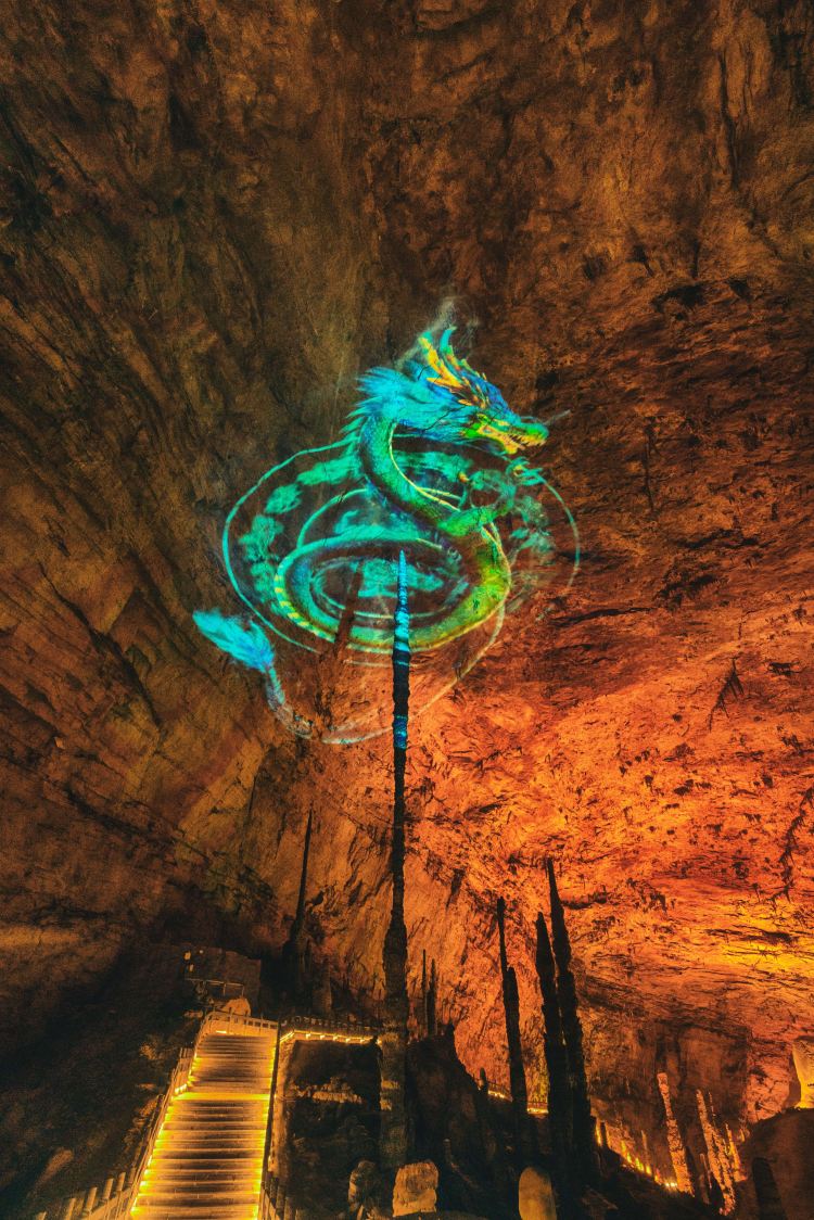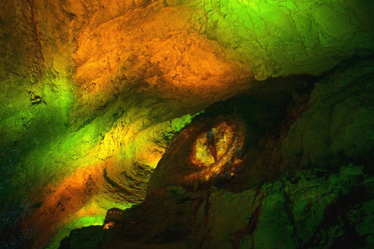黄龙洞景区以其高阔的洞天、幽深的暗河、密集的石笋而出名。洞中众多的石乳、石柱等各种钟乳石,在灯光的照耀下,多姿多彩。特别是标志性景点“定海神针”,高达20米的钟乳石柱,细处直径只有10厘米。