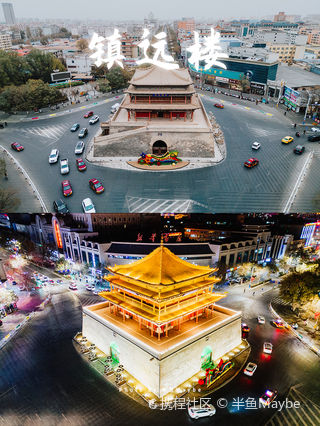 镇远楼是仿西安钟楼建造,平面方形,建在一座砖砌的坛上,台底宽32米,高9米,基座至楼顶30多米,楼为三层木构塔形,飞檐翘角,雕梁画栋。楼下有十字洞,通向东西南北,可以通过行人和小型车辆。