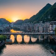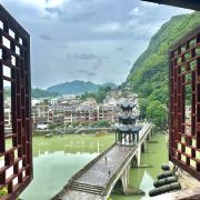 镇远古城位于黔东南周镇远县,舞阳河畔,河水蜿蜒着以“S”形穿城而过,形成一个类似太极图的样式,故又称八卦古镇。每年夏天,周边的游人纷纷聚集于此,热闹非凡。镇远县城被舞阳河一分为二,北岸是旧时士兵驻扎的地方,称之为卫城;南岸是行政机构和平民商家聚集的地方,称之为府城。至今城里仍残留有一些古城墙和城门遗址。舞阳河上有两座大桥,西侧是新修的,当地人称为新大桥,东侧的祝圣桥是镇远古城的标志性建筑,当地人称之为老大桥。新老大桥之间,是传统意义上的古镇地界,古镇由首尾相接的三条街道(新中街、兴隆街和顺城街)构成,街道两边与其他古镇类似,都是客栈、餐馆和店铺。