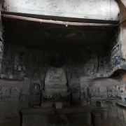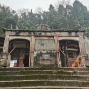 旁边有一条守护文物的犬,这也是在安岳石窟的文物保护区里面很统一的配置,每一个地方都有一条这样子的狗,据说是1:1的比例配给的,由文物的负责人负责养犬,保护这边的文物。