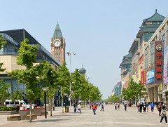 五一节前,北京气温升高,蓝天白云。人们居家已久,出来散步购物。王府井大街始建于元代至