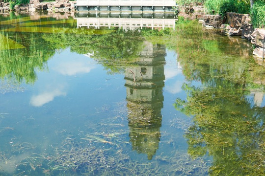 在湖边望去,晴天的兴国塔倒映在水面,有一种对称之美。