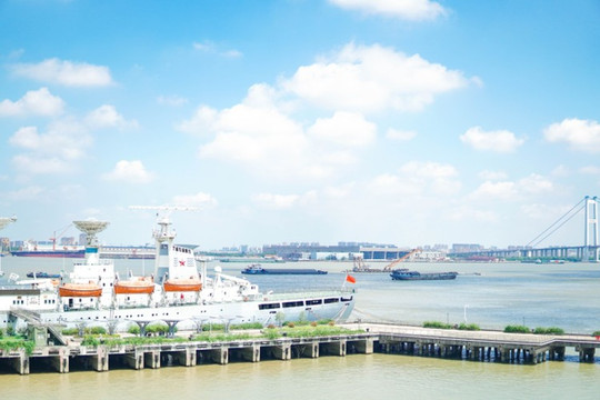 上到顶楼,可以远眺长江风貌,江面上船来船往,热热闹闹。