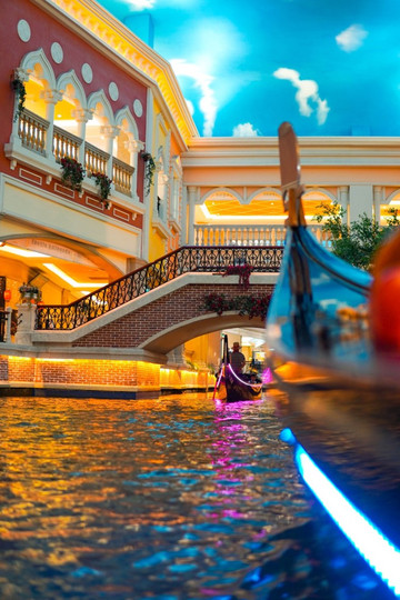 乘坐贡多拉小船游览,从码头上船一路会先进到商场里游览,我们乘船,看风景的人在桥上看你。