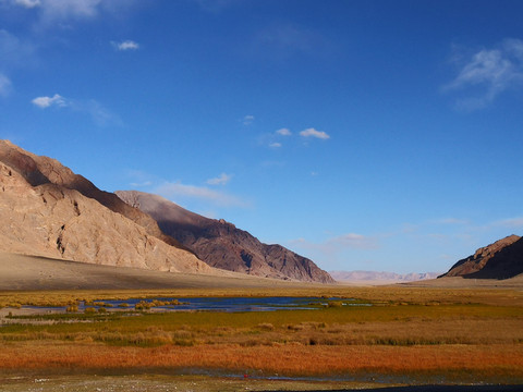 金草滩就在石头城下,因有塔什库尔干河流经此处,所以这里水草丰美,牛羊遍地。夕阳西照,碧绿的草滩一片金色,和远处牧人白色的毡房,羊群映衬在蓝天之下。