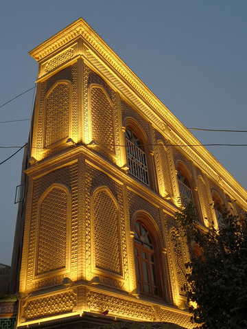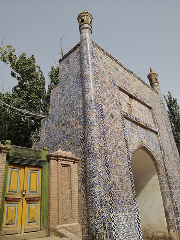 香妃园,四楼一拱顶全都用深绿色琉璃砖贴面,搭配高擎的五弯新月,建筑带有非常浓厚的伊斯兰教风格