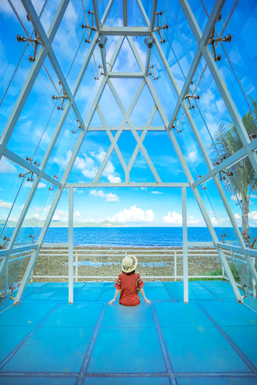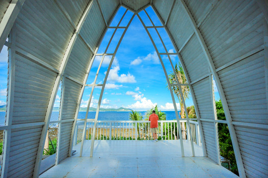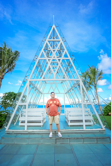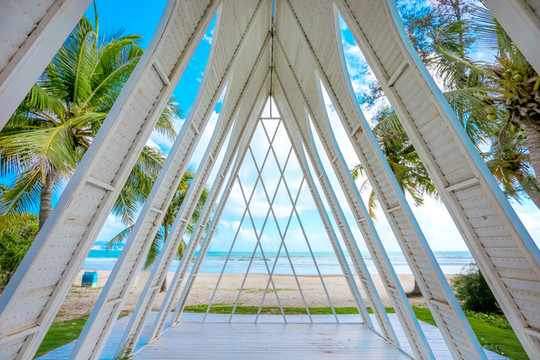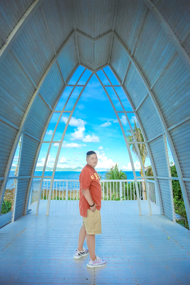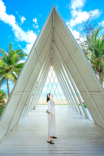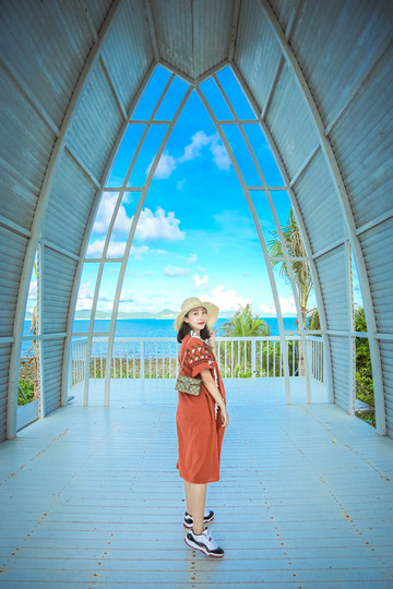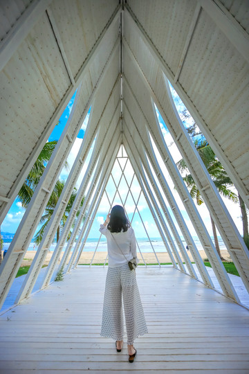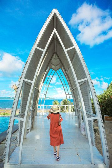 站在教堂内部,用大广角拍摄,让教堂的三角形构造充当画框,背景是 三亚湾 的美丽海景,这真是一个出片的好地方。
