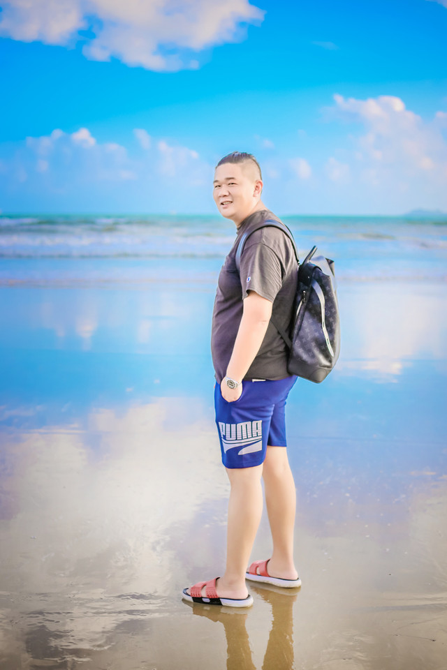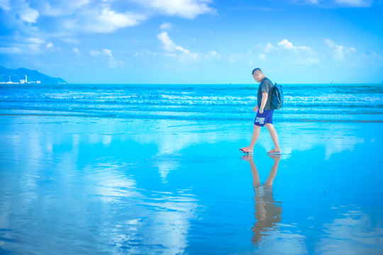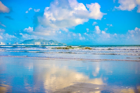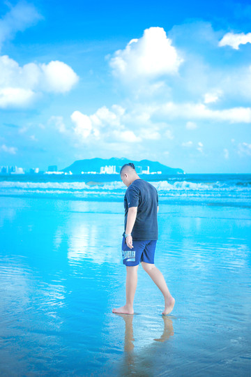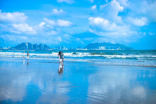 这一次,我提前查询好了攻略,在海之蓝海景公寓附近的这段海岸,非常好看。沙滩坡度平缓,光影绘就出天空之镜般的美景。大家要打卡 三亚湾 的话,建议去逛这一段。